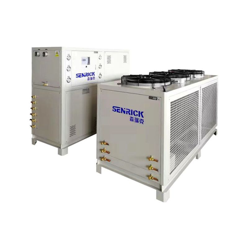 工業(yè)冷水機(jī)是一種通過蒸汽壓縮或吸收式循環(huán)達(dá)到制冷效果的機(jī)器。工業(yè)冷水機(jī)的工作原理是:先向機(jī)內(nèi)水箱注入量的水,通過冷水機(jī)制冷系統(tǒng)將水冷卻,然后再由水泵將低溫冷卻水送入需冷卻的設(shè)備,冷水機(jī)冷卻水將熱量帶走后溫度升高再回流到水箱,從而達(dá)到冷卻的作用。冷卻水的溫度可根據(jù)要求自動(dòng)調(diào)節(jié)。
